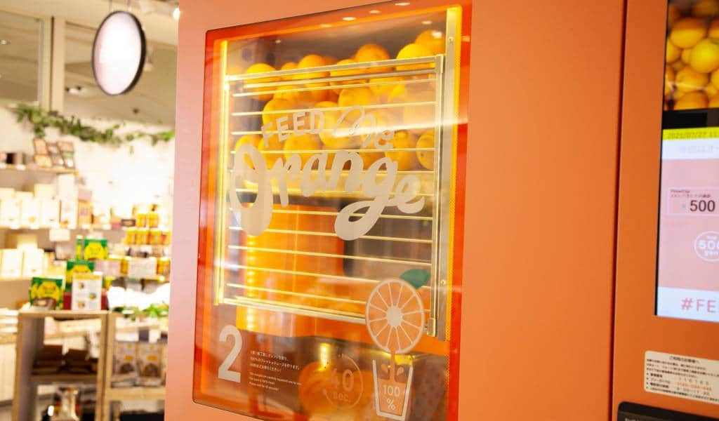 Namanya “Feed Me Orange” — mesin ini penuh dengan jeruk utuh yang langsung dipotong dan diperas di depan matamu. Dalam beberapa detik, kamu bisa minum jus jeruk segar tanpa tambahan gula atau pengawet.