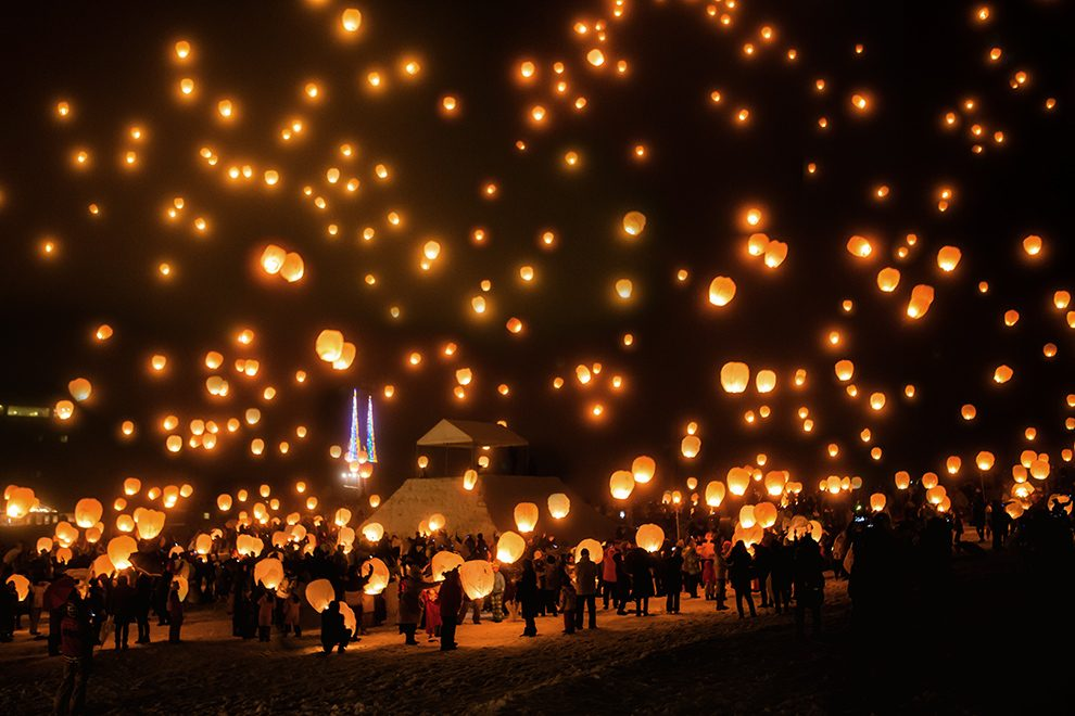 Festival salju di Tsunan, Niigata (salah satu daerah tersalju di Jepang). Ada snowboard jump competition, snow dome, snowmobile, snow treasure hunt, dan puncaknya 2.000 sky lantern dilepas malam hari. Highlight: Langit malam penuh lampion – sangat dreamy. Tips: Cocok buat yang ingin nikmati salju terakhir sebelum musim semi.