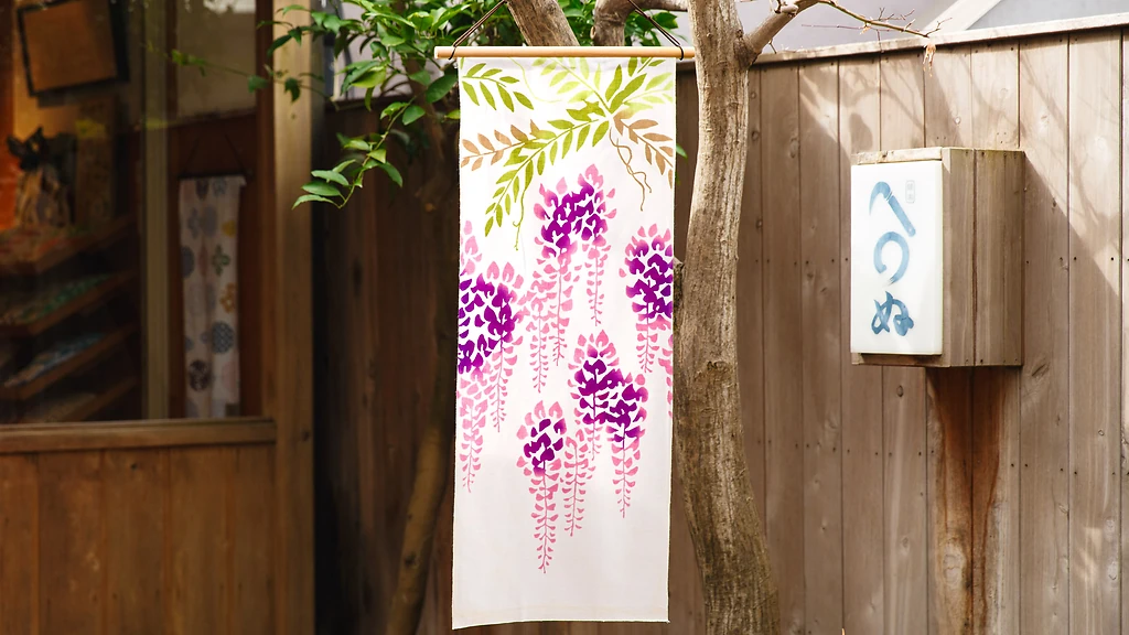 Meski bunga sakura yang paling sering jadi sorotan di musim semi, wisteria pun punya momen bersinarnya sendiri. Tenugui ini menampilkan rangka pergola yang dipenuhi wisteria ungu menjuntai dengan efek pewarnaan ombré yang memukau. Kain ini sangat indah dijadikan hiasan dinding, atau bila dilipat ganda, bisa menjadi tirai noren musiman yang cantik untuk pintu atau jendela.