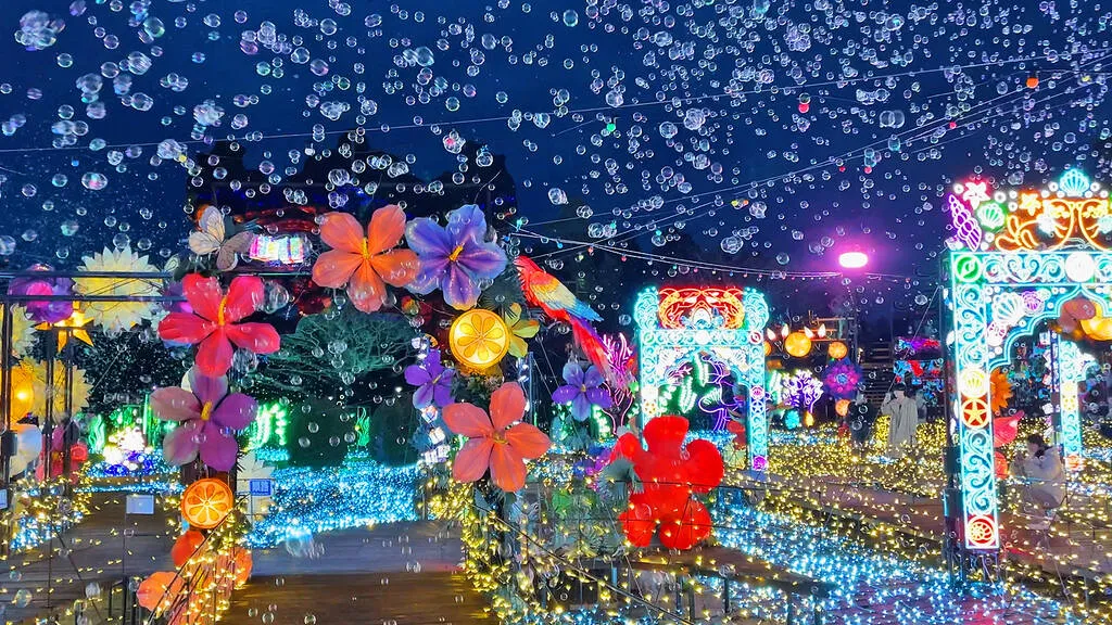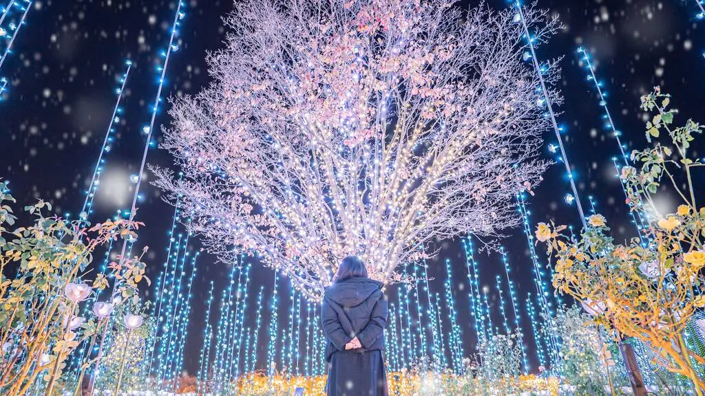 Ashikaga Flower Park menampilkan lebih dari lima juta lampu berbentuk bunga—tulip, wisteria, water lilies, hingga mawar dalam berbagai warna. Instalasi skala besar seperti kastil putih dan area bertema hewan menjadikannya salah satu iluminasi paling lengkap di Jepang.