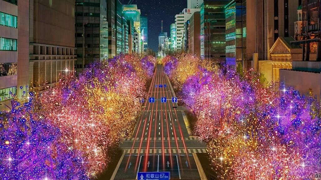 Midosuji Street dari Umeda hingga Namba berubah menjadi koridor cahaya dengan palet ungu, pink, dan gold. Jalan sepanjang 4 km ini memegang Guinness Record untuk jumlah pohon yang diterangi lampu terbanyak pada satu jalan.