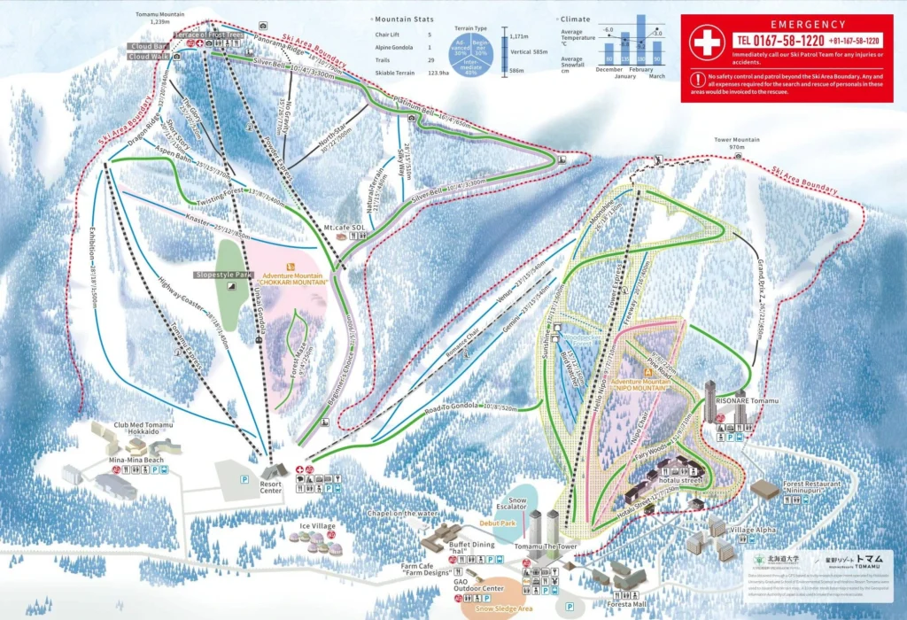 Tomamu memiliki dua gunung utama dengan 6 lift dan puluhan jalur ski yang bervariasi—mulai dari jalur pemula yang landai dan aman, hingga jalur expert dengan tantangan medan yang serius. Bahkan ada area tree skiing resmi, serta terrain park yang cocok untuk snowboarder yang suka atraksi.